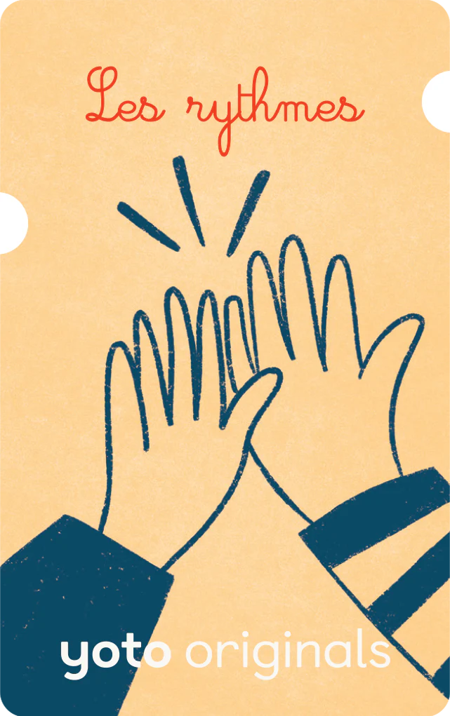 - Les rythmes - Cette carte va permettre à votre enfant de continuer son exploration sonore en s'appuyant sur les sons et les rythmes que l'enfant peut produire avec les différentes parties de son corps. En utilisant ses mains, ses pieds et bien d'autres parties de son corps votre enfant acquiert une conscience rythmique. Cette conscience est une des bases fondamentales de l'apprentissage de la lecture. L'écoute active présente dans les cartes 1 et 2 est renforcée ici par une approche corporelle.